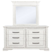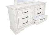 Rooted in traditional elegance, this dresser and mirror set brings vintage charm and refined detail to the bedroom. Framed with ornate carvings and softened by a distressed white finish, the six-drawer dresser offers ample storage with thoughtful touches—including a hidden jewelry tray in the bottom drawer. Antique bronze pulls and crown molding complete the look. Crafted from poplar and engineered wood, it’s designed with both beauty and function in mind. Key Features: • Six-drawer dresser and mirror set with ornate trim and traditional crown molding • Vintage white finish offers aged character with soft, antique-inspired appeal • Antique bronze drawer pulls provide contrast and decorative visual weight • Bottom drawer includes hidden jewelry tray for organized, concealed storage • Felt-lined top drawers and smooth glides add elevated function to daily use • Crafted from poplar, engineered wood, and mirrored glass for enduring charm