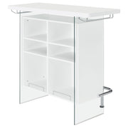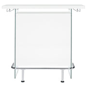 Elevate a multipurpose living room with this modern bar unit. A neutral finish, accented with polished chrome metal accents offers a striking design contrast. Supported and flanked by clear tempered glass side panels, this bar unit boasts ultra-modern elements as well for a dramatic feel. Compact yet highly functional, this bar unit also features ample storage space with six built-in open shelves for storing bottles, serving pieces and other mixologist must-haves. Tucked beneath the bar top along each side is a stemware rack for wine glasses and more. Key Features: • Modern front bar unit finished in white high gloss • Thick clear tempered glass side panels with steel footrest electroplated in chrome • Features six storage shelves and stemware racks • Constructed with MDF, particle board, glass, and metal