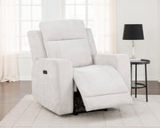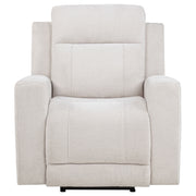 Retreat into relaxation with this chenille power recliner chair designed for everyday indulgence. A smooth, push-button reclining mechanism lets you find your ideal position with ease. Wrapped in richly textured chenille and supported by a strong metal frame, it offers the perfect blend of plush comfort and durable design. Ideal for solo lounging, this chair brings quiet luxury and functional ease to any living space. Key Features: • Power recliner offers smooth, quiet reclining at the touch of a button • Ivory chenille upholstery features a soft feel and refined textured weave • Generously padded headrest and arms enhance relaxation and support • One-touch control allows seamless transitions to your ideal position • Durable metal framing ensures everyday strength and long-term use • Polyester chenille combines plush comfort with easy-care maintenance