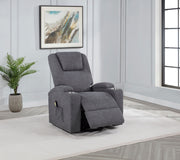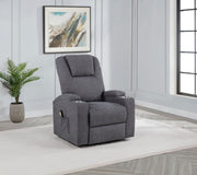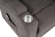 Gracefully merging comfort, function, and care, this power lift massage chair offers a luxurious retreat at the touch of a button. Wrapped in soft chenille, its plush silhouette supports you with gentle recline, heated massage, and a smooth lift mechanism—perfect for easing into or out of relaxation. Dual stainless steel cup holders and side storage pockets provide thoughtful utility, making it a serene and supportive haven for everyday unwinding. Key Features: • Power lift massage chair in dark grey chenille offers wired remote-controlled recline and lift • Heat and vibration massage functions provide soothing comfort at the touch of a button • Stainless steel cup holders on both arms keep beverages secure and accessible • Side storage pockets on both sides hold remotes, reading material, or small essentials • Plush cushioning with supportive back and pillow-top arms enhances everyday comfort • Ideal for those seeking independence, recovery support, or elevated daily relaxation