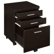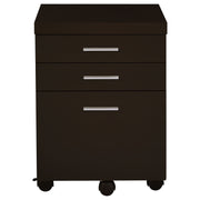 Stay organized in style with this mobile file cabinet, designed for both functionality and modern appeal. Featuring a rich cappuccino finish, this compact storage solution seamlessly blends into any home or office setup. Two spacious drawers and a file compartment provide ample space for documents, supplies, and office essentials. The built-in casters ensure smooth mobility, allowing for effortless repositioning. Sleek silver hardware accents add a contemporary touch, while its durable engineered wood construction ensures lasting use. Key Features: • Sleek mobile file cabinet with a modern cappuccino finish • Two drawers and a file compartment for organized document storage • Designed to accommodate both legal and letter-size files • Smooth-rolling casters provide effortless mobility in any office space • Durable MDF and engineered wood construction for long-lasting use • Sleek silver handles enhance the cabinet’s contemporary design
