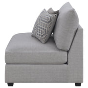 This armless chair offers versatility and modern appeal for today’s living spaces. Upholstered in soft grey fabric, its clean lines and plush cushions provide both comfort and style. Designed with a modular structure, it easily connects with matching components to form a sectional or stands alone as an accent seat. Crafted with solid wood legs, a sturdy frame, and reversible cushions wrapped in feather down, this upholstered chair delivers lasting durability and inviting comfort for any contemporary home. Key Features: • Armless chair features a modern silhouette in soft grey fabric for versatile styling • Modular design allows combination with matching components for custom layouts • Reversible seat and back cushions offer extended use and easy maintenance • Feather-down wrapping enhances plush comfort and luxurious seating feel • Crafted with solid wood legs and sturdy frame for lasting structural integrity • Ideal as a standalone accent seat or sectional component in modern living rooms