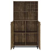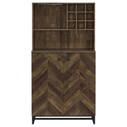 This rustic bar cabinet features a striking herringbone pattern and a warm oak finish, perfect for enhancing any living or dining space. With ample bottle and stemware storage, it offers function and flair in equal measure. The mixed material construction and clean lines bring modern charm to your home entertaining setup. Key Features: • Transitional bar cabinet with classic herringbone front for timeless appeal • Finished in a rich rustic oak tone that complements modern and vintage décor • Built-in wine rack stores up to nine bottles within easy reach • Integrated stemware rack and upper cubbies offer display and storage options • Crafted from engineered wood with a durable, scratch-resistant veneer • Sleek gunmetal legs and hardware add industrial edge to its design
