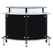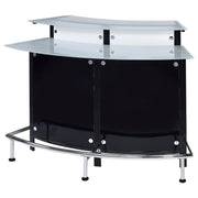 Entertain in sleek sophistication with this modern home bar, featuring a curved silhouette, chrome accents, and glossy black and white acrylic panels. Dual-tiered frosted glass tops offer ample space for mixing and serving, while the metal footrest invites guests to sit back and enjoy the experience. Designed to impress in any lounge or entertaining space. Key Features: • Contemporary home bar with a bold black finish and sweeping modern curves • Features sleek frosted and clear glass tops for stylish drink prep and serving • Eye-catching black and white acrylic panels add dramatic visual contrast • Includes stemware rack and built-in wine racks to hold up to eight bottles • Crafted with durable chrome metal, acrylic panels, and tempered glass • Polished electroplated chrome footrest provides added guest comfort and style