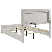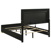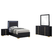 Gleaming gold accents create a sense of richness and elegance for a contemporary bedroom set. In a black finish that's crisp and timeless, the set offers a stylish, modern bed complete with a squared headboard and low footboard, offering an airy feel in your bedroom. The headboard is equipped with built-in LED lighting operated by touch switches on the left and right sides, within easy reach from either side of the bed. The mood lighting creates a lovely ambiance while accent pieces in the set offer plenty of storage. The dresser is topped with a framed mirror, great for opening your space and providing a great spot for choosing jewelry or a tie in the morning. Key Features: • Sleek black finish with gold accents for a contemporary look • 4-piece queen bedroom set includes bed with LED headboard, nightstand, dresser, and mirror • LED headboard with touch switches for easy operation • Dresser topped with framed mirror for added storage and style • Mood lighting creates a lovely ambiance in the bedroom