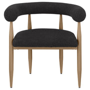 Sinuous curves bring unified style and sophistication to the table and chairs in this five-piece modern dining set. It delivers a stylish rectangular table complete with a sculpted base in a warm, rich bronze finish. The tabletop is black finish glass, adding cool, glossy elegance. Chairs feature U-shaped backrests and plush seats, both with foam padding and textured black boucle upholstery. Tapering legs in a matching bronze finish complete the chairs and create a sense of cohesion for the set.
