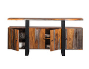 Cozy and rustic, this grey sheesham server is full of charm. Perfect for a contemporary space, the elongated lines on the front feature a sleek black finish. Variations in hue and in wood grain offer a stunning visual that looks great on its own or when topped with stylish sculptures or small, decorative pieces. Complete with four cabinet doors with minimalist-inspired hardware, this server creates a beautiful visual. Serve in style with the open legs and raised table top.