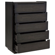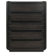 Balance and beauty meet in this five-drawer chest, where softened curves and a deep burnished black finish bring quiet depth to the room. Recessed pulls and rounded corners echo a modern sensibility, while black felt-lined top drawers protect what matters most. Designed with English dovetail joinery, soft-closing glides, and a fully enclosed dust panel, this tall silhouette blends sculptural refinement with everyday function. Key Features: • Five-drawer chest in burnished black with rounded edges and sculpted minimal lines • Top drawer lined in black felt to cradle jewelry, watches, and other essentials • Soft-closing ball bearing glides ensure smooth, quiet drawer function • English dovetail drawer construction enhances durability and craftsmanship • Dust panel base provides fully enclosed storage and a clean internal finish • Crafted from Asian hardwood, engineered wood, and ash veneer for strength