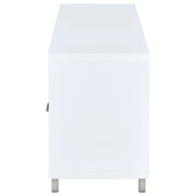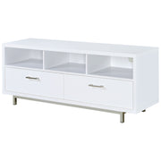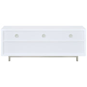 Ideal for a living room with contemporary decor, this TV console exudes updated style. The dazzling shine of chrome combines with a crisp, clean white finish for a pleasingly modern look. Its chic silhouette is complete with an elegant brushed silver frame, adding a pleasing touch of polish. Endlessly versatile, it features three open storage compartments and two large lower drawers to easily keep your space organized. For added depth and a more subdued look, this console is also available in deep, rich cappuccino. Key Features: • TV console finished in white with metal base finished in chrome • Constructed with MDF, particle board, laminate, and steel • Features three (3) storage compartments and two (2) storage drawers • Available in white and cappuccino • Euro drawer glides