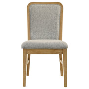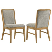 This dining side chair blends mid-century inspiration with plush modern comfort. The curved back is designed to gently hug the body, upholstered in soft grey fabric that adds inviting texture. A weathered natural wood frame with rounded posts and softened leg corners brings subtle character without excess detail. Padded with dense foam for lasting support, it’s crafted from solid wood and engineered components to offer both durability and everyday ease in the dining room. Key Features: • Dining side chair with curved backrest designed to gently hug and support the seated body • Upholstered in soft grey plush fabric that offers texture and everyday comfort • Weathered natural finish highlights the rounded frame and minimalist form • Rounded posts and soft leg corners create a warm modern silhouette without fuss • Foam-padded seat and backrest provide comfort for daily meals or longer gatherings • Crafted from solid rubberwood, engineered wood, fabric, and supportive foam