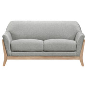 Gracefully curved silhouettes and retro-inspired lines define this timeless seating ensemble. Sculpted flared arms, contoured backrests, and plush cushions blend form and function with refined ease. Upholstered in soft grey polyester and framed in light blonde rubberwood, each piece offers a perfect balance of comfort and mid-century style. Ideal for living rooms or lounge areas, this tailored set brings cozy sophistication to any setting. Key Features: • Sofa set features flared arms and contoured backrests for retro-inspired elegance • Blonde wood finish adds warmth and contrast to the exposed wood framework • Smooth curved silhouettes provide a vintage feel with modern tailored comfort • Soft foam cushions across all seating ensure inviting support for daily use • Upholstered in grey polyester fabric for a soft touch and durable performance • Crafted from solid rubberwood for lasting structure and design integrity