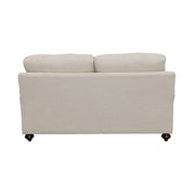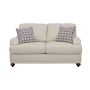 Take advantage of charming farmhouse influence that steers the design of this stylish loveseat. With tailored English arms and turned legs offering a contrasting espresso finish, this loveseat shines with a light grey linen-like upholstered cover. Two reversible cushions T-cushions create comfort and stay in shape, as a solid wood frame with a sinuous spring deck sets the stage for durability. Attached back cushions remain stationary to prevent shifting. Enjoy the designer look of two accent pillows with a houndstooth patterned cover. Key Features: • Bring LOVE to your living area with this sophisticated farmhouse collection • Tailored English arms • Turned legs in espresso • No rearranging required with easy to maintain attached back cushions • Extend the life of your upholstery set with reversible seat cushions
