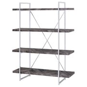 Enhance your storage and display space with this contemporary bookshelf, featuring a rustic grey herringbone finish for a modern organic touch. The sleek chrome metal frame provides durability and style, complemented by an X-shaped back support for stability. Four open shelves extend beyond the frame, creating a bold, geometric aesthetic perfect for showcasing books, décor, or collectibles. Crafted from engineered wood and metal, this shelving unit blends industrial and modern styles seamlessly, making it a stunning addition to living rooms, offices, or bedrooms. Key Features: • Four-tier bookshelf with a bold open-shelf design for a modern look • Rustic grey herringbone finish adds warmth and organic charm • Sleek chrome metal frame with X-back support enhances durability • Extended open shelves provide ample display space for books and décor • Crafted from engineered wood, MDF, and metal for long-lasting use • Ideal for home offices, living rooms, or contemporary spaces