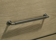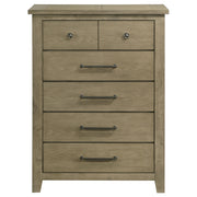 Designed with a relaxed sensibility, this five-drawer chest of drawers blends classic structure with subtle rustic appeal. Its vineyard oak finish highlights the oak grain embossing across solid rubberwood and engineered veneer surfaces. Antique nickel metal knob and pull handles add a touch of industrial charm, while heavy-duty metal ball bearing extension slides ensure smooth, dependable drawer operation. A balanced blend of softness and strength for modern bedroom storage. Key Features: • Five-drawer chest of drawers with clean lines and softly textured oak grain finish • Crafted from solid rubberwood with engineered wood veneer for durability • Vineyard oak finish enhances the natural depth of embossed wood grain • Antique nickel hardware includes a mix of metal knob and pull handles for added contrast • Heavy-duty metal ball bearing extension slides ensure smooth and reliable drawer movement • Fully assembled and includes tip-over restraint for enhanced safety