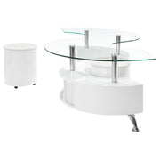 This coffee table features a serpentine shape with a clear tempered glass top and a durable engineered wood base. It includes two stools with padded seats, upholstered in faux leather for added comfort. A sliding door on both sides provides convenient storage space, while chrome accents enhance its sleek, modern design. This piece combines practicality with contemporary style, making it an ideal centerpiece for any living room. Key Features: • Curved serpentine coffee table with clear tempered glass top and chrome accents • Engineered wood construction for lasting durability and sturdy design • Two stools with faux leather upholstery and padded seats for added comfort • Sliding door opens to reveal convenient storage on both sides of the table • Chrome accents contribute to the sleek and modern aesthetic • Cappuccino wood-look finish provides a rich, sophisticated appeal