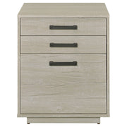 Streamline your workspace with this modern file cabinet, designed to enhance both form and function. The clean, box-style silhouette is finished in a soft whitewashed grey that brightens any office setting. Three spacious drawers provide organized storage for files, stationery, and office essentials. Sleek gunmetal bar pulls add an industrial touch, balancing the light tone with subtle contrast. Built from engineered wood and a durable laminate veneer, it offers strength and everyday practicality. Key Features: • File cabinet with three drawers for files, supplies, and office accessories • Whitewashed grey finish offers a light, contemporary aesthetic • Gunmetal bar pulls provide subtle industrial contrast and grip • Engineered wood with laminate veneer ensures surface durability • Compact cube shape fits under or beside standard desks • Ideal for modern home office, study, or shared workspaces