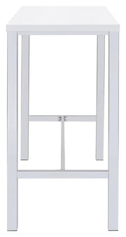 Ultra-modern with a clean lined silhouette, this five-piece bar set comes complete with a rectangular shaped bar table and four bar stools. Perfect for more contemporary home, the table comes with sleek and square legs made and a steel frame in an electroplated and polished chrome finish that lends a luxurious gleam to any room. The tabletop features a high gloss white lacquer finish and seats four people comfortable. Each stool also features a matching lustrous high gloss white seat and matching legs. One the stools are also footrests for extra support and stability.