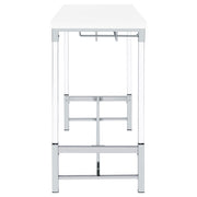 Create the ideal spot to share a bottle of wine with friends with a contemporary bar table. Perfect for two to four, it boasts a crisp, streamlined silhouette with an elevated tabletop in a bright white finish. The base features a silver finish and trestle details. Acrylic legs add a sense of light, airy ambiance, perfect for a compact nook or dining room. The table includes a built-in six-bottle wine rack and two stemware racks that make pouring a glass of your favorite vintage simple and easy.