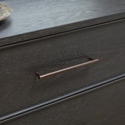 Add effortless style and architectural appeal to your bedroom with the Waterfall dresser. This spacious dresser features a timeless silhouette defined by clean lines and simple geometric shapes. Antiqued copper-finish hardware and a dark brown base add a striking accent to the deep ebony finish. Ample storage for clothing and other essentials is provided with six soft-close drawers. This dresser is expertly crafted from solid rubberwood and oak veneers, and features dovetail joinery for long-lasting durability.