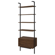 Play up the light, airy ambiance of a modern space while making use of every inch with a modern wall bookcase. It features four floating upper shelves and a lower case with two drawers, perfect for a blend of storage and display in any room. The shelves and two drawers feature a warm walnut finish over melamine paper, offering durability for a lovely look that lasts. A black finish metal frame supports the bookcase, offering neutral appeal in any setting. Stash essentials in the drawers while adding decor to shelves for a personal look and feel.