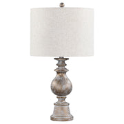 Dress up end tables and consoles with this elegant, contemporary table lamp. Designed with a contoured poly frame with intricate details, this sophisticated table lamp lends itself to transitional interiors easily. Enhanced by the weathered appearance of the antique gold finish on the base, this table lamp is sure to bring about an old world charm. A straight, round drum shade with an oatmeal colored fabric offers a hint of texture and a light accent to the metallic base. A three-way switch allows you to adjust the lighting to your desired illumination. Key Features: • Traditional base design offers classic detailing • Antique gold finish with light distressing lends a vintage feel • Clean lines of the drum shade offers a modern touch • An oatmeal colored fabric offers texture and neutral color palette • Three-way switch offers multiple lighting brightness