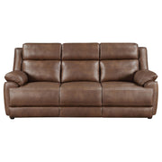 A chic mottled effect brings authenticity to the lush faux leather upholstery of a transitional sofa. Seating three, it features a dark brown color...