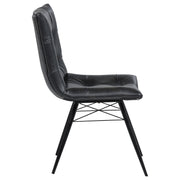 Blending mid-century modern aesthetics with everyday comfort, this dining side chair is a stylish addition to any dining space. Upholstered in charcoal faux leather, its gently curved tufted seat and backrest offer a supportive and inviting feel. Angled metal legs with crossing braces enhance stability while adding a striking visual element. The armless design provides a sleek, space-saving silhouette, making this chair ideal for both casual and formal dining settings. Key Features: • Mid-century modern dining chair with a sleek armless silhouette • Charcoal faux leather upholstery offers a refined and stylish touch • Gently curved backrest and seat provide ergonomic comfort and support • Button tufting adds depth and sophistication to the overall design • Angled metal legs with crossing braces enhance stability and durability • Versatile design complements contemporary, industrial, and modern spaces