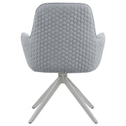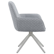 Blending mid-century modern design with contemporary comfort, this swivel dining armchair offers both style and function. Upholstered in light grey fabric, it features a plush bucket seat with low arms and a tall backrest for exceptional support. The honeycomb-quilted exterior adds texture and sophistication, while the 360-degree swivel base in a sleek chrome finish ensures smooth mobility. Perfect for casual or formal dining, this chair enhances any modern space with its elegant and practical design. Key Features: • Modern swivel dining chair with a stylish mid-century bucket seat design • Light grey fabric upholstery adds a soft, refined touch to any dining space • Honeycomb-quilted back enhances texture and sophisticated detailing • Low armrests and tall backrest provide comfort and ergonomic support • 360-degree swivel base in chrome ensures easy movement and accessibility • Ideal for contemporary, modern, or transitional dining room settings