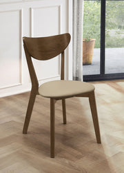 Kersey chair teams well with the retro table from the same collection. Angled legs for a no-nonsense approach. Yet, no arms and deep-curved back impart a smidge of unpredictability. Chestnut finish enlivens a classic dining area. Cushioned seat upholstered in tan leatherette delivers comfort and durability during a marathon game of chess. Key Features: • Dining side chairs with angled legs and deep curved backrests inspired by retro design • Chestnut wood finish adds a warm and natural tone to the mid-century modern profile • Tan leatherette seat offers smooth texture with padded foam for daily comfort • Armless design enhances space-saving functionality around smaller tables • Crafted from solid rubberwood, engineered wood, and faux leather • Assembly required with lightweight construction for easy placement