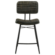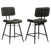 Bring a refined retro presence to your space with this genuine leather counter height chair set. Upholstered in hand-dyed leather for a soft, lived-in feel, each stool showcases a contoured seat and supportive backrest with channel tufting and welt trim. The black iron frame features flared tapered legs and a built-in footrest for stability and comfort. A bold X-brace accent at the back adds visual contrast and industrial flair. Perfect for kitchens, bars, or gathering spaces, this set blends vintage design with everyday durability. Key Features: • Counter chair set blends vintage character with modern durability • Wrapped in genuine leather upholstery with an antique camel tone • Channel tufting and welt trim add rich dimension and tactile appeal • Iron X-brace backrest provides strength and visual contrast • Sturdy black iron frame with footrest ensures lasting stability • Set of two counter height chairs ideal for kitchens or bar areas