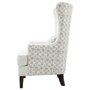 A haven for relaxation, this tasteful accent chair is also a source of inspired beauty, perfect for your semi-formal living area. Sit in supreme comfort on a chair with a frame built of various woods as artisan design elements include an ultra-high wing back with gentle contouring, abbreviated track arms, and a removable T-cushion with polyester filling creating extra support. Geometric patterning accents its gray boucle fabric upholstery in key places, and a welt trim kidney shaped pillow provides extra comfort. Deep brown finish wood legs form curvy silhouetting. Charming silver nail head trim completes a chic package of features for a must-have chair.