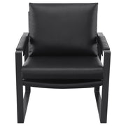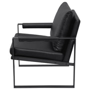 Cool modern style turns the Rosalind accent chair into a tasteful choice for your casual living room or home office. Begin with the lush feel of eco-friendly smooth vegan leather upholstery. This accent chair borrows from a retro motif yet updates any space with a carefree ambiance. Its gunmetal finished metal frame adds an open squared design on side brackets with strips of upholstery covering each armrest. Sit comfortably on a removable seat and lean against a back cushion with generous padding.