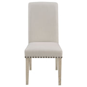 Appreciate the sophisticated look of a tall silhouette with fresh, inspiring style. This dining chair offers a versatile look that blends well with glass, wood, or metal tables. Transitional in motif, it combines invigorating modern touches with classic elements. A neutral upholstered wrap generates light, airy ambiance. Charming nail heads line the bottom of its seat edge, and narrow tapered legs with a neutral finish balance a stylish palette. Key Features: • Tall silhouette with fresh, inspiring style perfect for glass, wood, or metal tables • Transitional motif combining modern touches with classic elements • Neutral upholstered wrap creates light, airy ambiance • Charming nail heads line bottom of seat edge • Narrow tapered legs with neutral finish balance stylish palette