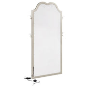 Chic couture style is a featured element of a lighted LED floor mirror well suited to fashionable living spaces. The Evangeline floor mirror offers a shapely silhouette with an arch top and rectangular profile. Its pine wood frame offers a silver oak finish, delightful and decadent. Side hangers add convenience, and LED lighting on its mirrored section is both mood-inducing and functional. A floor switch operates this glam-inspired mirror. Key Features: • Chic couture style floor mirror with arch top and rectangular profile • Pine wood frame with silver oak finish • Side hangers for convenience • LED lighting bordering frame for mood and function • Floor button on/of switch operation
