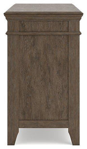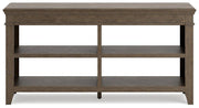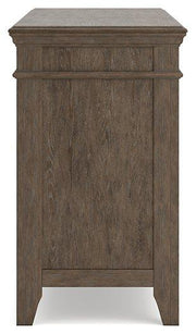 Make a style statement with this home office credenza. Its traditional design is updated with an on-trend weathered gray finish and wire-brushed texture. The credenza's open storage and adjustable shelving add up to a well-organized workspace.