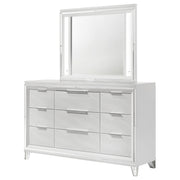 Elevate your bedroom decor with this stunning dresser and mirror set, featuring a modern Italian design with a striking white finish. The dresser offers ample storage with nine drawers, picture framed recessed panels, and embossed herringbone graphic patterns, while the mirror adds a touch of sophistication with its mirror framing and touch LED light. Accented with polished chrome metal hardware and acrylic legs, this set combines style and functionality. Crafted from rubberwood, MDF, and mirror, this dresser and mirror set is a perfect addition to your luxurious bedroom. Key Features: • Dresser and mirror set with modern Italian design • Striking white finish with mirror framing and polished chrome metal hardware • Dresser with nine drawers, picture framed recessed panels, and embossed herringbone graphic patterns • Mirror with touch LED light for added sophistication • Crafted from rubberwood, MDF, and mirror